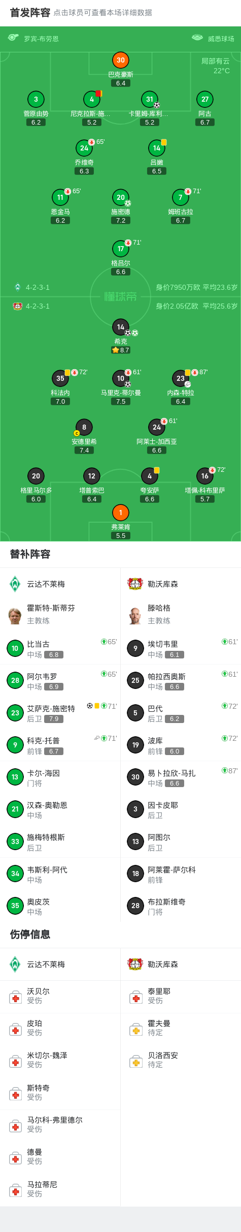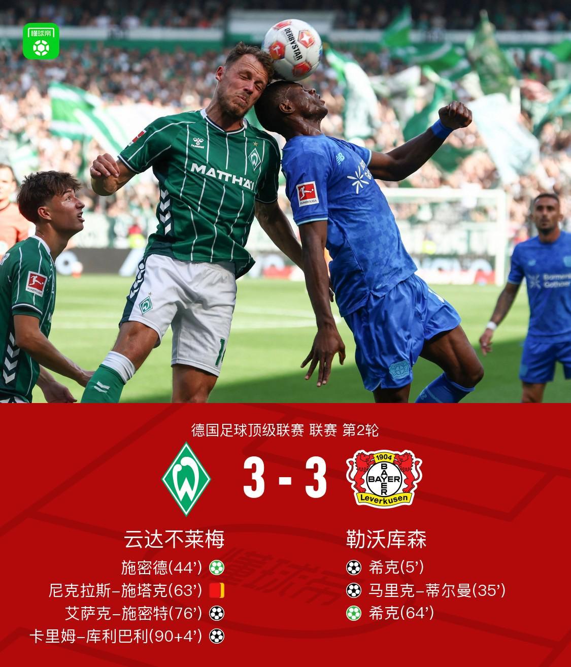 北京时间8月30日德国足球顶级联赛第2轮,云达不莱梅主场迎战勒沃库森。比赛开始后,勒沃库森由内森-特拉助攻希克首开纪录。随后,马里克-蒂尔曼扩大比分,帮助球队上半场便取得两球领先。第44分钟,施密德主罚点球命中,为云达不莱梅扳回一城。下半场开始后,云达不莱梅球员尼克拉斯-施塔克因累计两张黄牌被罚下场,球队陷入被动。紧接着,希克再次罚入点球,完成个人梅开二度。落后的局面下,科克-托普送出助攻,艾萨克-施密特破门得分。比赛进入补时阶段,卡里姆-库利巴利挺身而出,帮助球队再度追近比分。最终,双方以3-3握手言和。