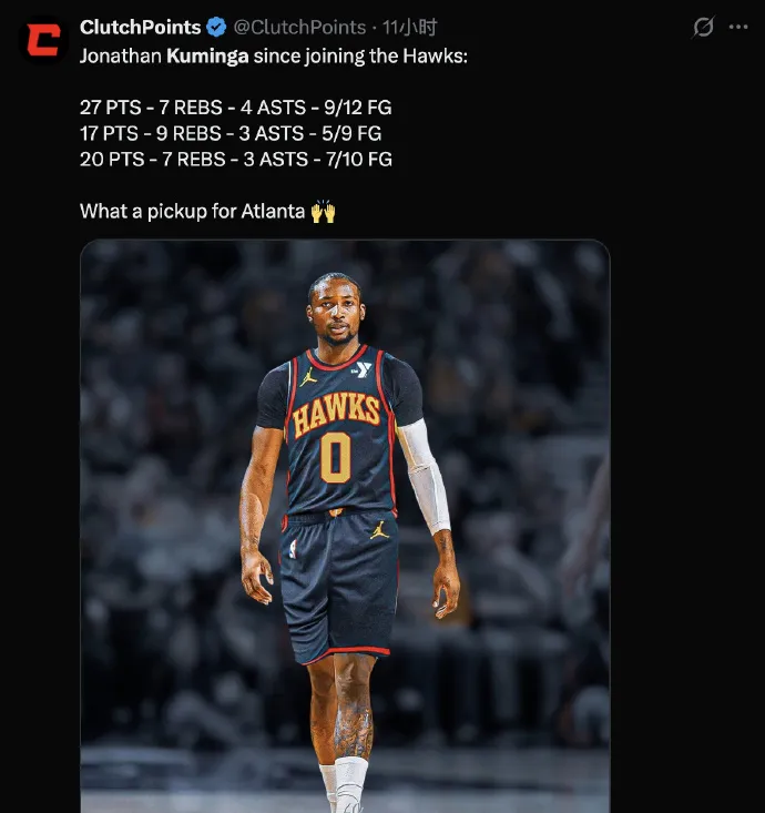 另一方面,老鹰正围绕杰伦·约翰逊等年轻核心进行重建,库明加出色的运动能力和锋线天赋,恰好契合球队的重建方向,被视为球队锋线未来的重要拼图。更为关键的是,当时库明加的交易价值因市场冷清而被压低,老鹰用一份即将到期的合同换来他,即使未来无法达成续约,损失也十分有限,属于典型的“低风险高回报”的淘宝式操作。
