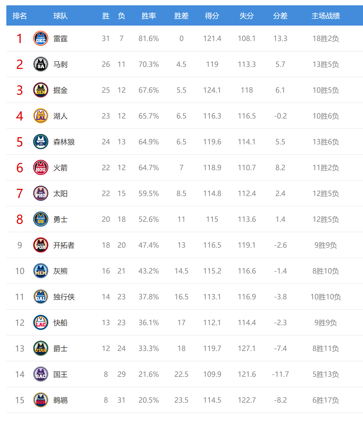 雷霆赢球后结束2连败,战绩31胜7负排名联盟第一,爵士输球后12胜24负排名西部第13。