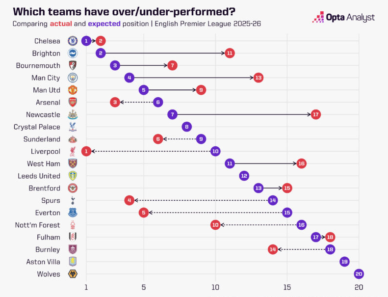 当前英超积分榜上,曼城3轮2负排名第13,但预期积分(xG)模型给出更积极的图景:若按预期进球数据模拟10000次比赛结果,曼城实际应排名第四。