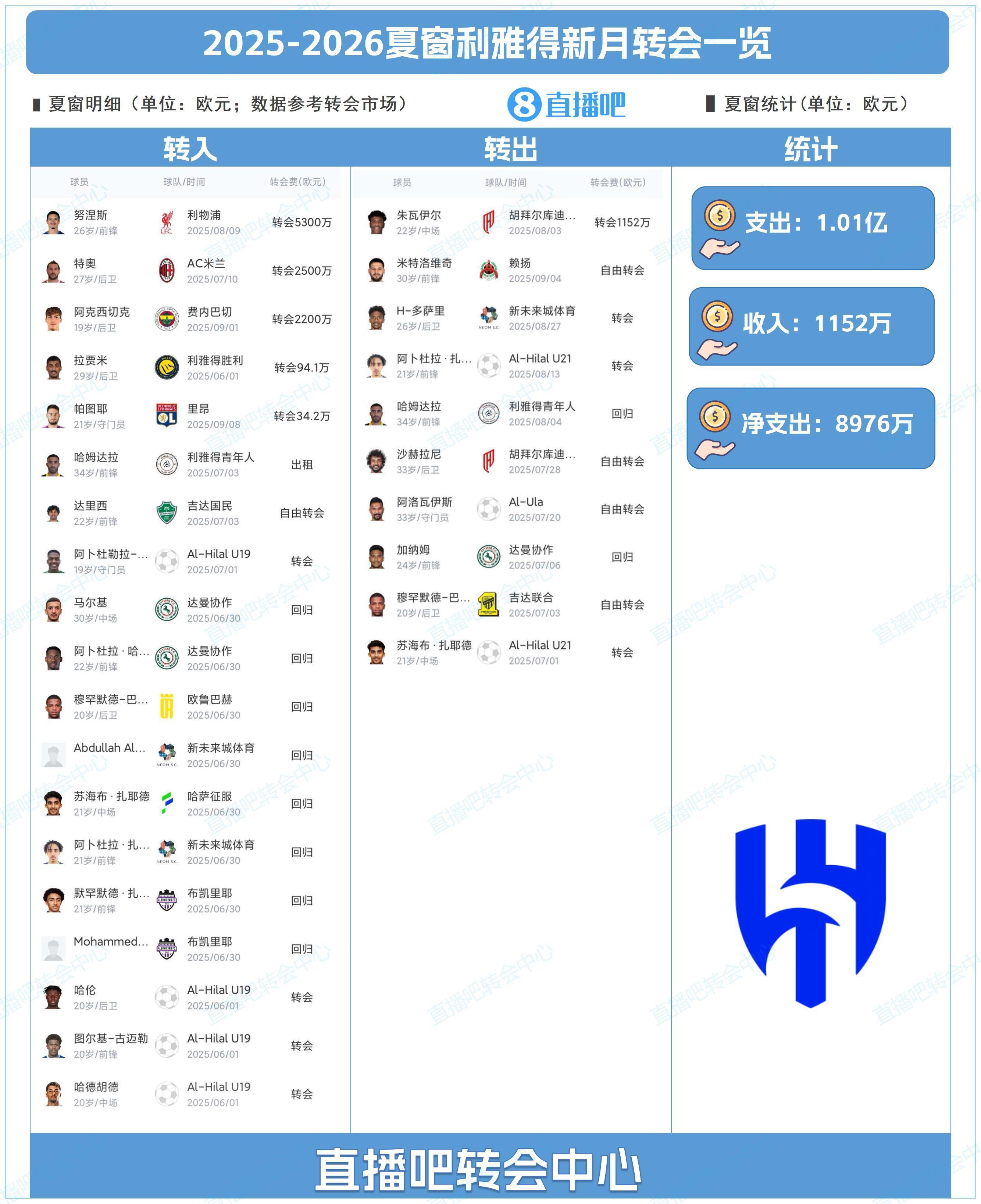 直播吧为吧友们总结了利雅得新月今夏的转会操作,吧友们能打几分?