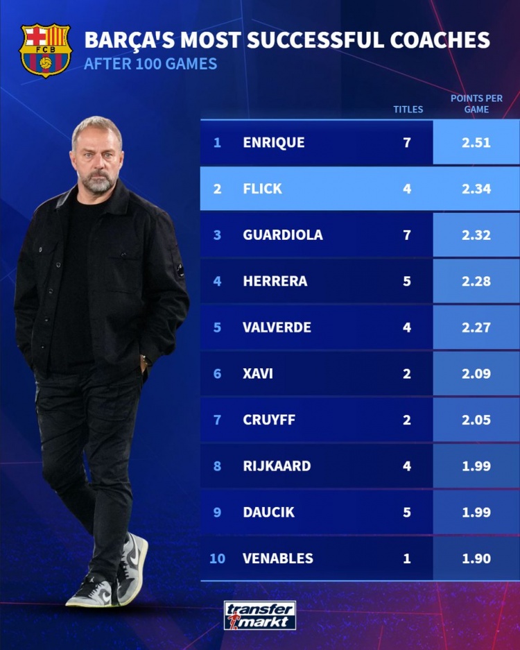 3月3日讯 德国转会市场统计了各教练执教巴萨前100场的场均积分,并列出榜单,恩里克2.51分居首,弗里克2.34分次席。